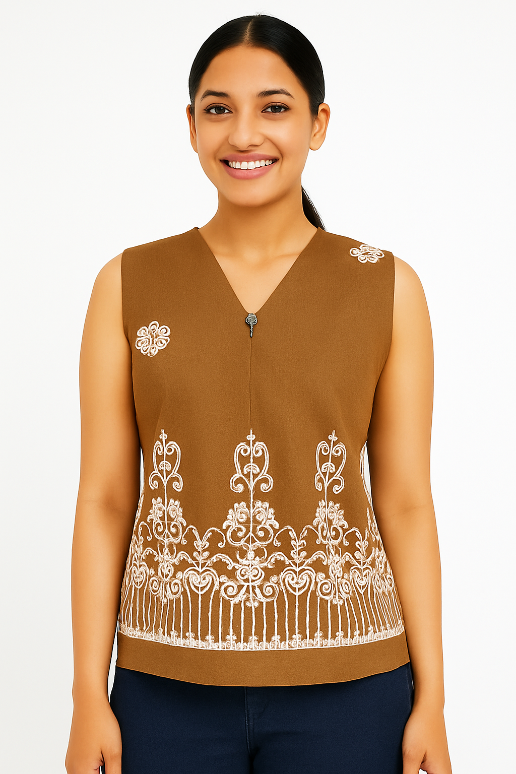 A rich brown sleeveless top with white ethnic embroidery and a V-neckline brooch—classic with a twist.
