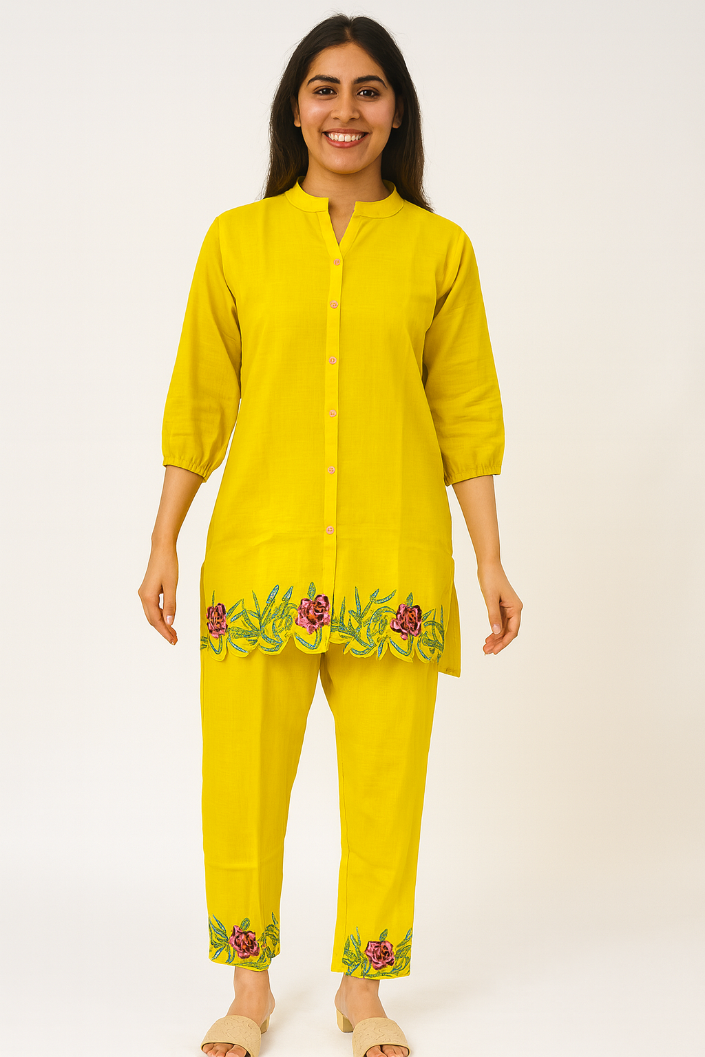Bright lemon yellow co-ord set with rose embroidery on hem and pants.
