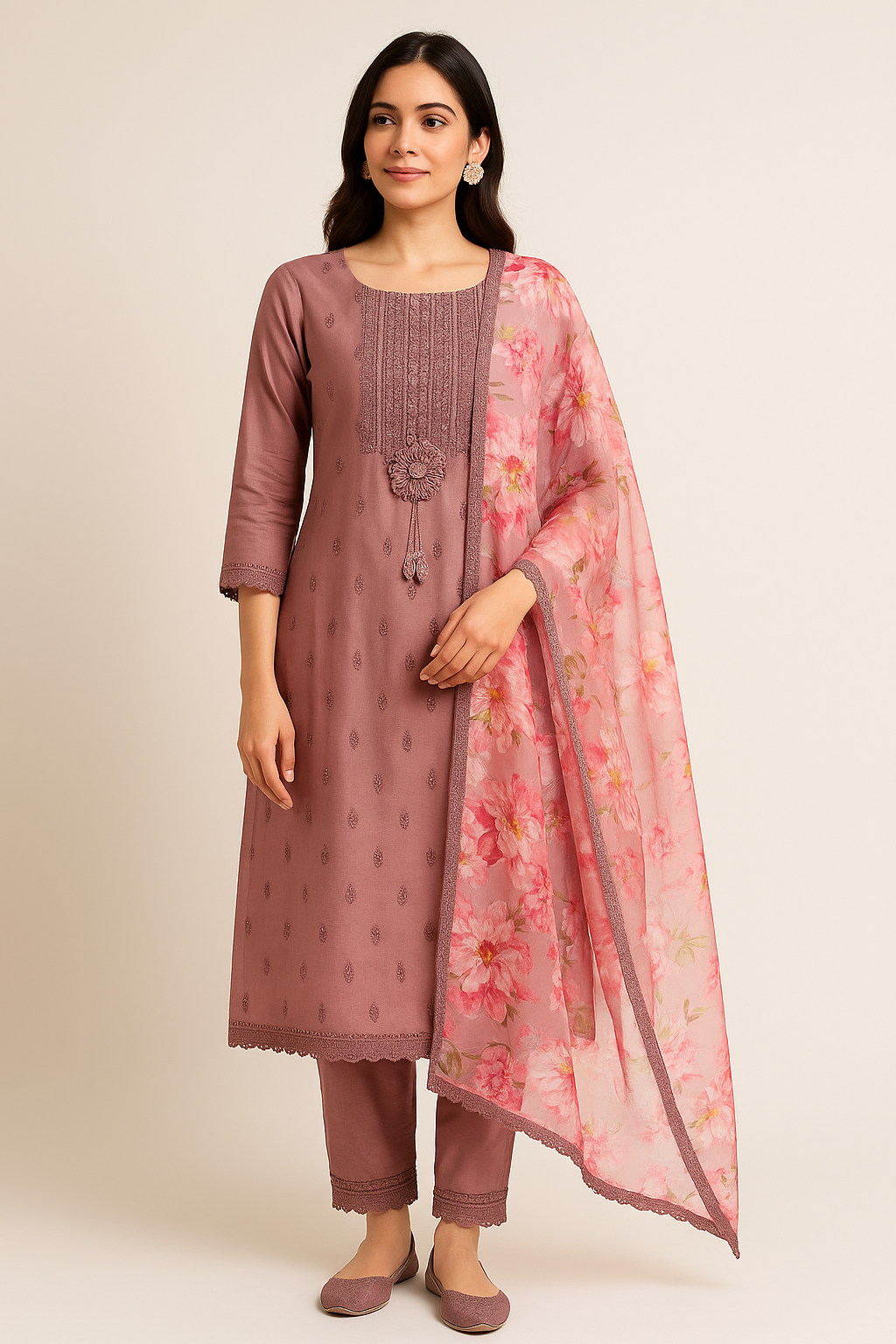 Bring a touch of romance to your wardrobe with this graceful dusty mauve embroidered kurta set. The kurta features elegant thread embroidery along the yoke and hemline, accented by a 3D floral motif and tassel detailing at the center. The soft pastel palette is complemented by a sheer organza dupatta adorned with blooming floral prints in pink and green, adding a feminine and fresh touch. The outfit is completed with coordinated pants featuring lace detailing at the hem, offering a well-rounded, chic ethnic look.