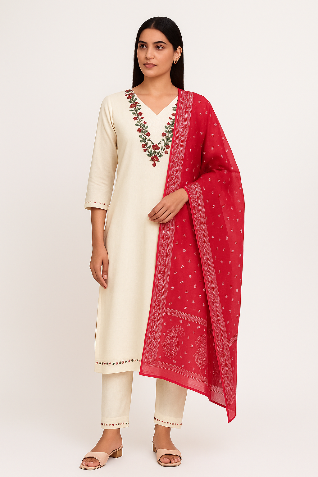 Ivory suit with rose vine embroidery and red printed dupatta.