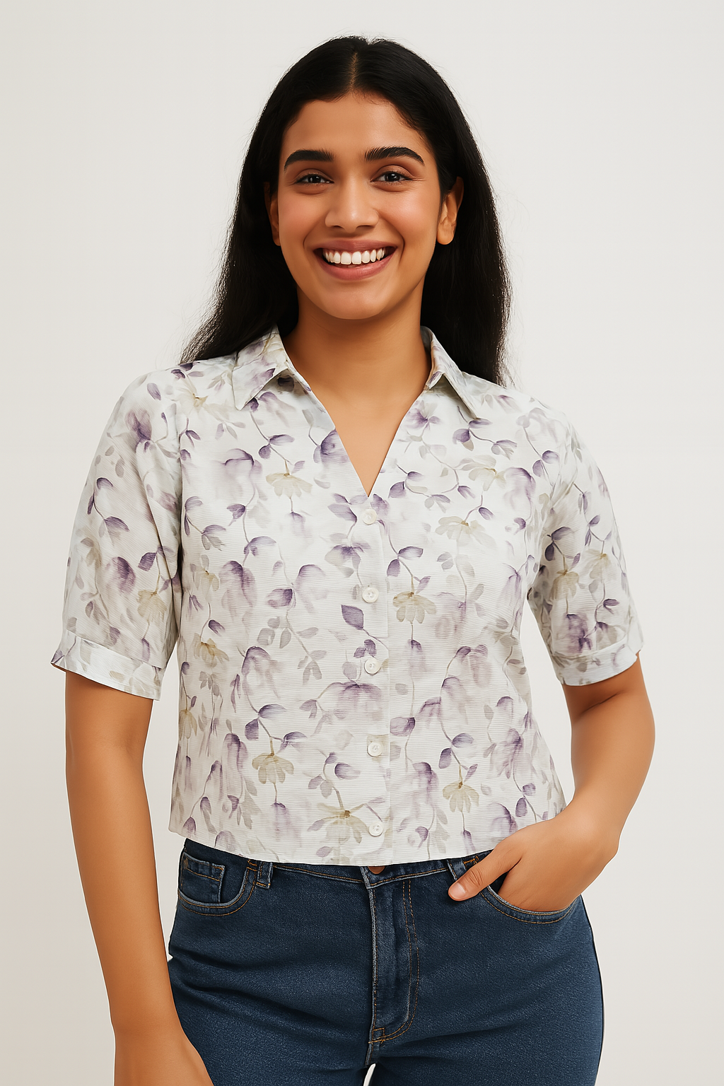 Fresh and feminine, this lavender-toned shirt comes adorned with soft purple and beige floral motifs. It features a sharp collar, front button closure, and short sleeves with turned cuffs. Its relaxed cropped fit makes it perfect for warm-weather styling — just team it with denims or linen pants for a comfy-chic vibe.