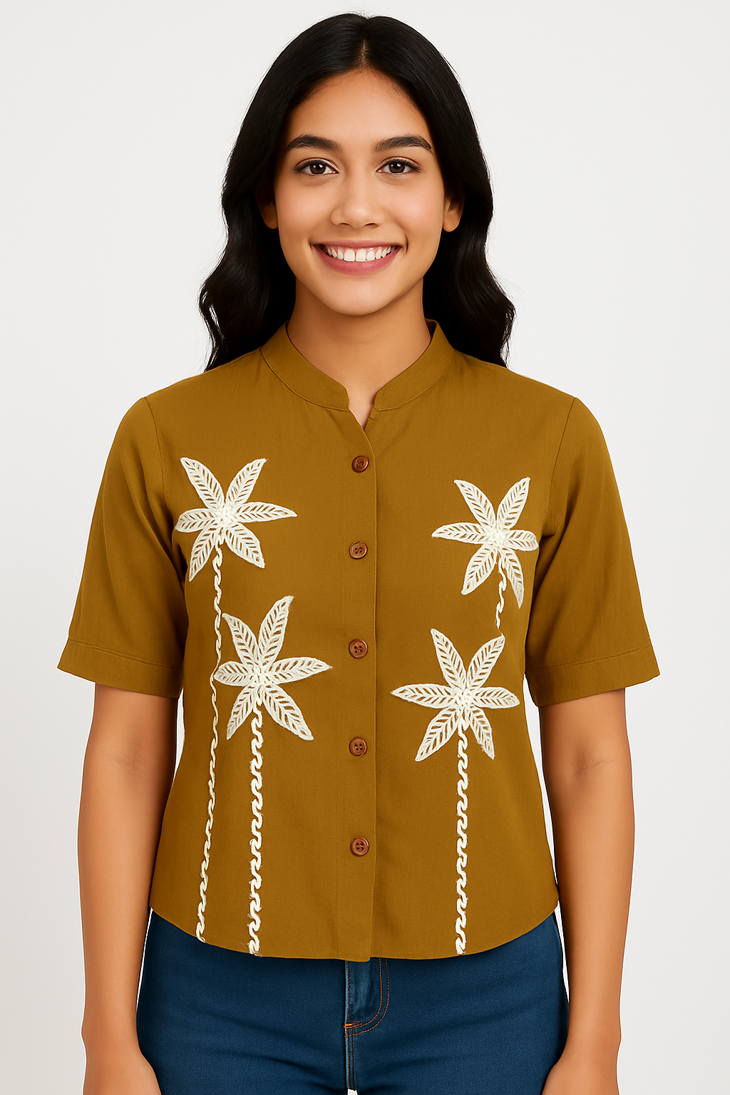 Rich in tone and design, this mustard brown top is detailed with off-white embroidered tropical motifs, giving it a warm and artistic flair. The mandarin collar and wooden-style buttons bring in natural elements that complement the deep color perfectly. Whether you’re dressing up for a brunch or curating a smart-casual office look, this top offers the perfect blend of tradition and trend. Pair it with denim, beige, or black bottoms to highlight its standout design.