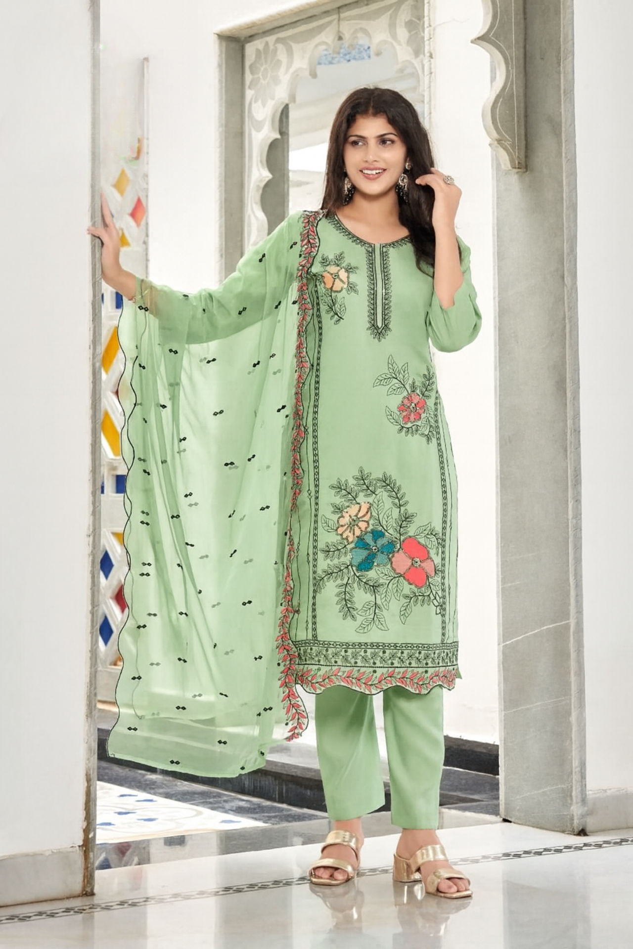 This pastel green suit set radiates freshness with its multicolor floral embroidery and elegant dupatta. Crafted in soft cotton with a straight silhouette, it’s perfect for festive days and elegant ethnic wear.