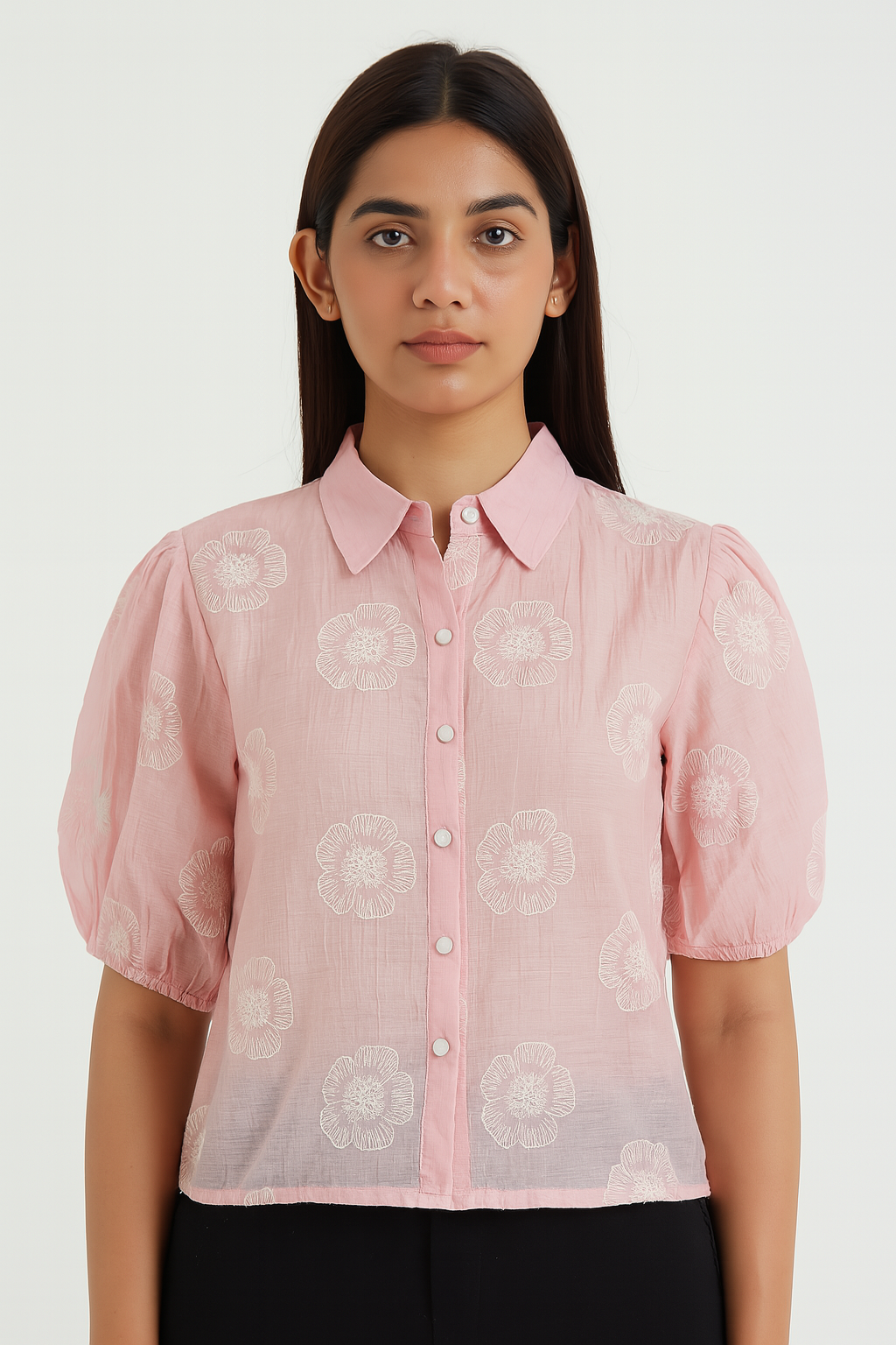 Step into elegance with our Pink Puff Sleeve Floral Embroidered Shirt, perfect for those who love a fresh and romantic touch. Featuring delicate white floral embroidery and chic puff sleeves, this piece combines comfort with effortless style.